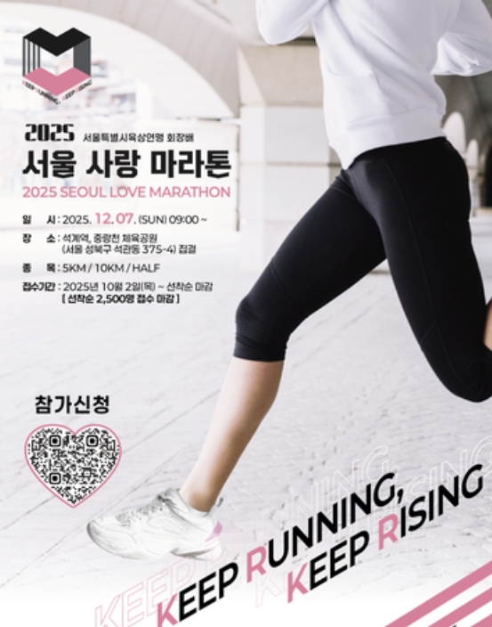 2025년 겨울, 서울사랑마라톤과 함께 특별한 도전을 시작해보세요. 중랑천을 달리며 느끼는 성취감과 함께하는 러너들의 응원은 추운 겨울을 따뜻하게 만들어줄 거예요. 지금 바로 '서울사랑마라톤' 공식 홈페이지에서 신청하고, 12월 7일 일요일 오전 9시에 중랑천 체육공원에서 만나요!🏃♀️